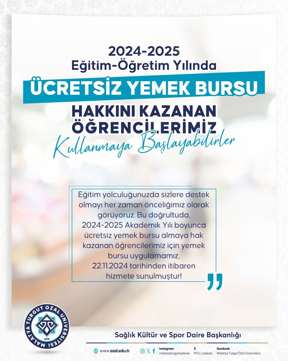 Eğitim yolculuğunuzda sizlere destek olmayı her zaman önceliğimiz olarak görüyoruz. Bu doğrultuda, 2024-2025 Akademik Yılı boyunca ücretsiz yemek bursu almaya hak kazanan öğrencilerimiz için yemek bursu uygulamamız, 22.11.2024 tarihinden itibaren hizmete sunulmuştur!