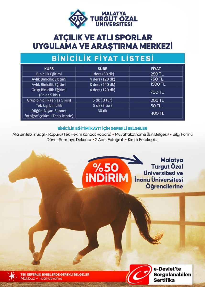 Atçılık ve Atlı Sporlar Uygulama ve Araştırma Merkezi Binicilik Fiyat Listesi Güncellendiği Tarih: 24-05-2024 15:55 |
