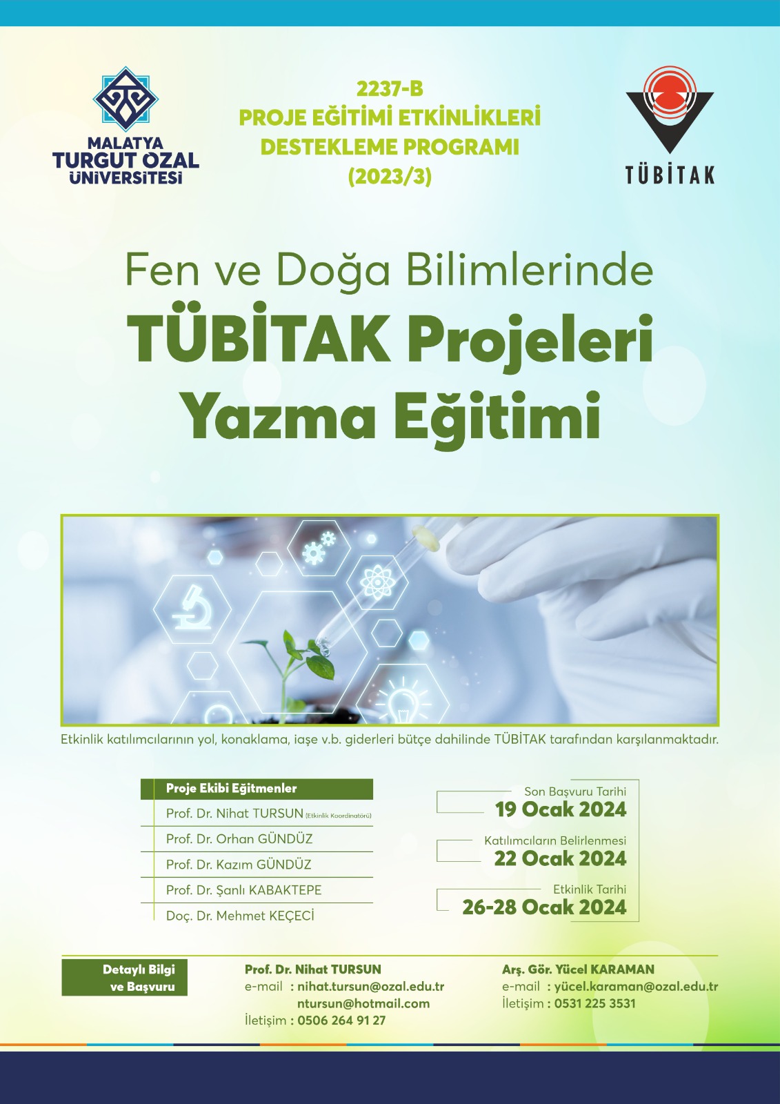 TÜBİTAK BİDEB 2237-B Proje Eğitimi Etkinliklerini Destekleme Programı kapsamında desteklenen “Fen ve Doğa Bilimlerinde TÜBİTAK Projeleri Yazma Eğitimi” etkinliği 26-28 Ocak 2024 tarihleri arasında Malatya Turgut Özal Üniversitesi ev sahipliğinde yapılacaktır.