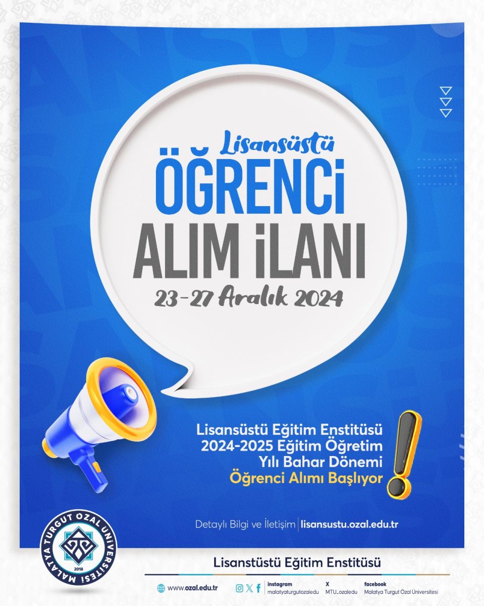 Lisansüstü Eğitim Enstitüsü 2024-2025 Eğitim Öğretim Yılı Bahar Dönemi Öğrenci Alımı Online başvuruları 23 Aralık 2024 09:00 ile 27 Aralık 2024 17:00 tarihleri arasında gerçekleştirilecektir.