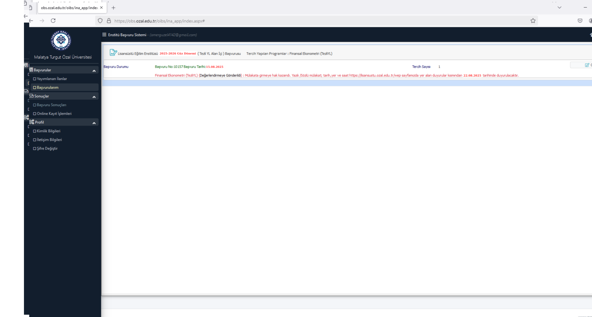 ► Başvurusunun onaylandığını veya onaylanmadığını, adaylar https://obs.ozal.edu.tr/oibs/ina_app/login.aspx. adresinden BAŞVURULARIM kısmından öğrenebilirler.