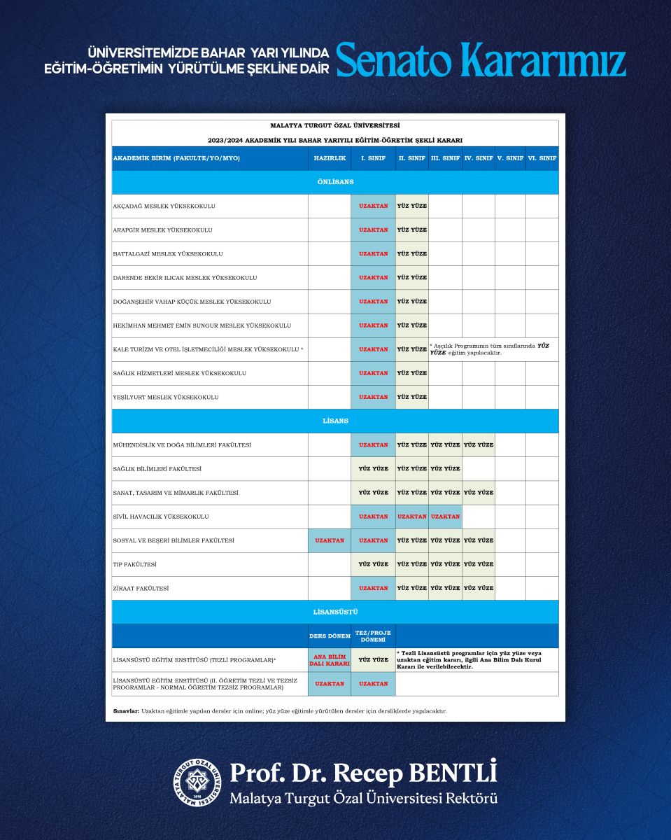 6 Şubat depremlerine bağlı yaşanan barınma sorununun devam etmesi ve , Gençlik ve Spor Bakanlığı İl Müdürlüğü ile yapılan görüşmelerde öğrenci yurtlarının hali hazırda tümüyle dolu olması nedeniyle Üniversitemize bağlı akademik birimlerimizde 2023/2024 Bahar Yarıyılında eğitim-öğretim faaliyetlerinin aşağıdaki şekliyle yürütülmesinin uygun olacağına karar verilmiştir.