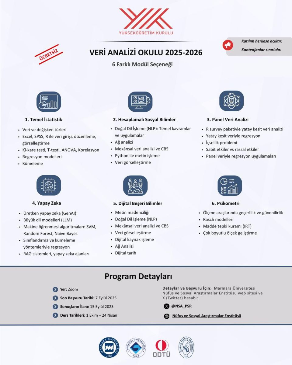 Veri Analizi Okulu, 1 Ekim 2025’te başlayacak ve 24 Nisan 2026’ya kadar sürecek. Eğitimler çevrim içi gerçekleştirilecek ve Temel İstatistik, Panel Veri Analizi, Psikometri, Hesaplamalı Sosyal Bilimler, Dijital Beşerî Bilimler, Yapay Zekâ olmak üzere altı ayrı modülden oluşacak.