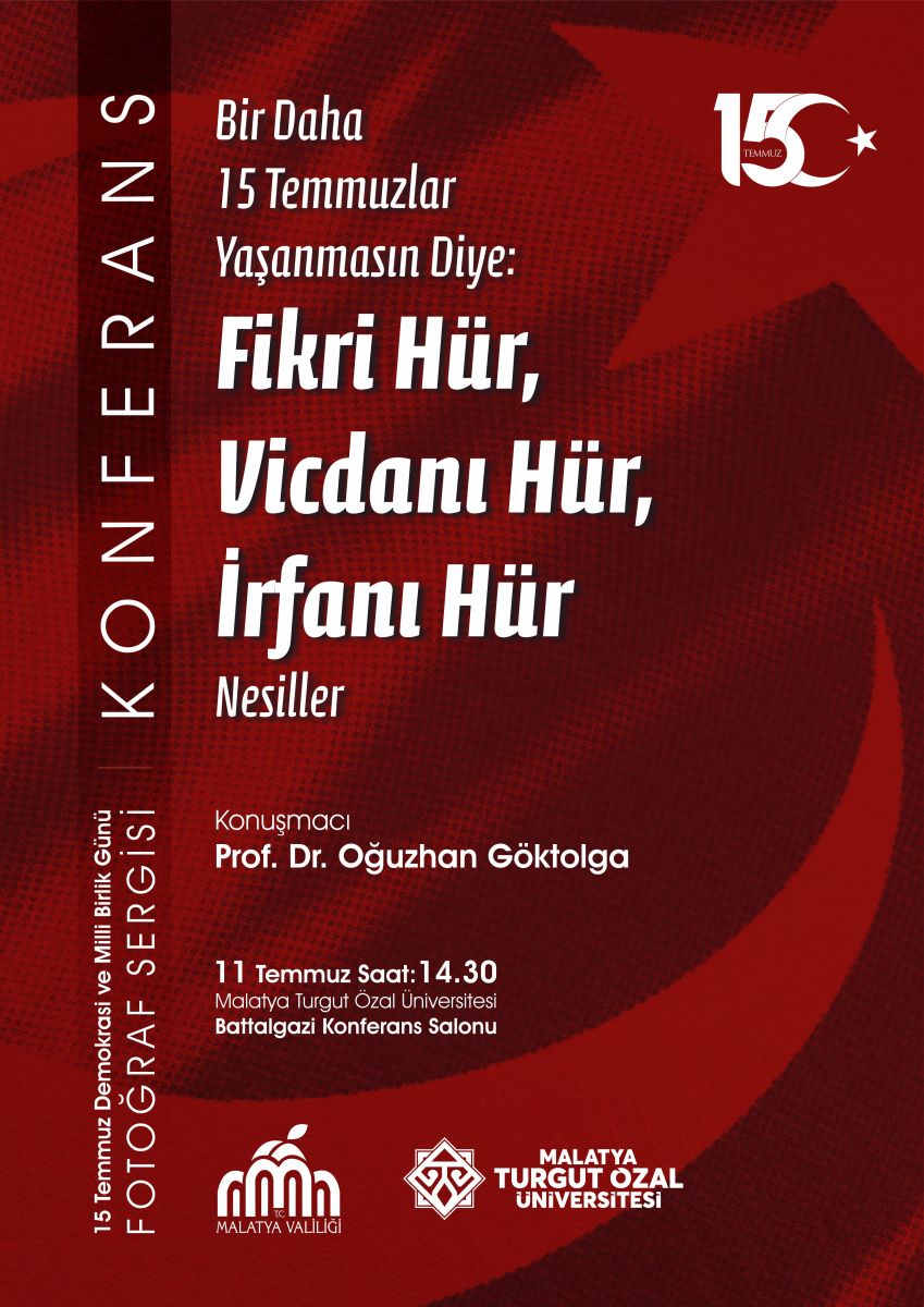Bir Daha 15 Temmuzlar Yaşanmasın Diye: Fikri Hür, Vicdanı Hür, İrfanı Hür Nesiller Konferansı Güncellendiği Tarih: 10-07-2024 13:33 | Başlangıç Tarihi: 11-07-2024 14:30 | Bitiş Tarihi: 11-07-2024 15:30 | YER: Malatya Turgut Özal Üniversitesi