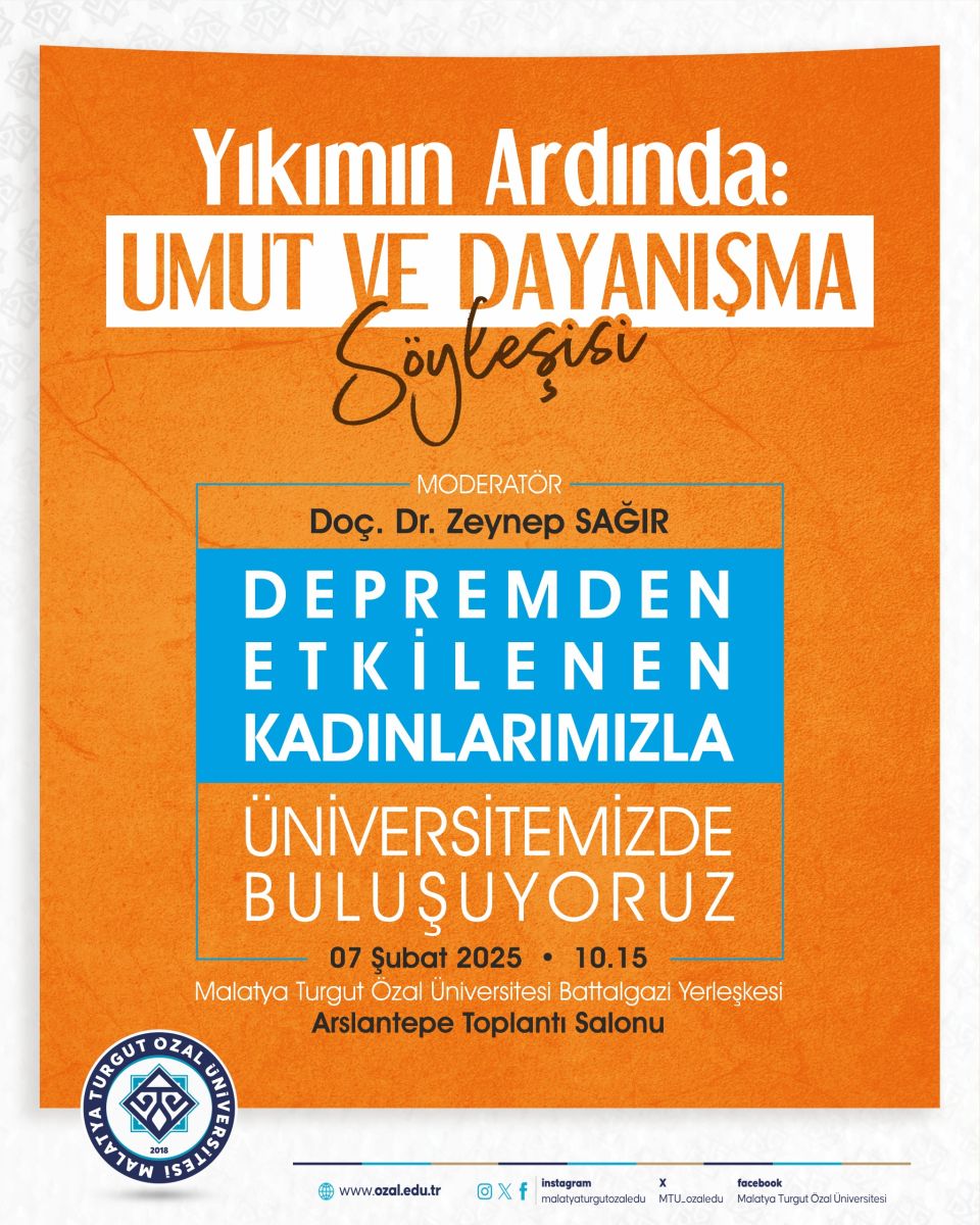 Yıkımın Ardında: UMUT VE DAYANIŞMA Söyleşisi Güncellendiği Tarih: 05-02-2025 15:19 | Başlangıç Tarihi: 07-02-2025 10:15 | Bitiş Tarihi: 07-02-2025 13:00 | YER: Malatya Turgut Özal Üniversitesi