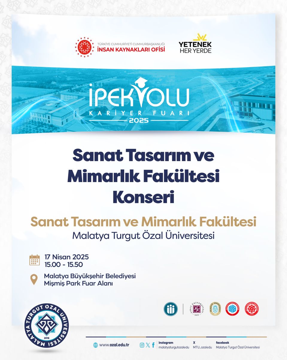 İPEKYOLU KARİYER FUARI ETKİNLİKLERİ Güncellendiği Tarih: 14-04-2025 11:19 | Başlangıç Tarihi: 17-04-2025 15:00 | Bitiş Tarihi: 17-04-2025 15:50 | YER: Malatya Büyükşehir Belediyesi Mişmiş Park Fuar Alanı