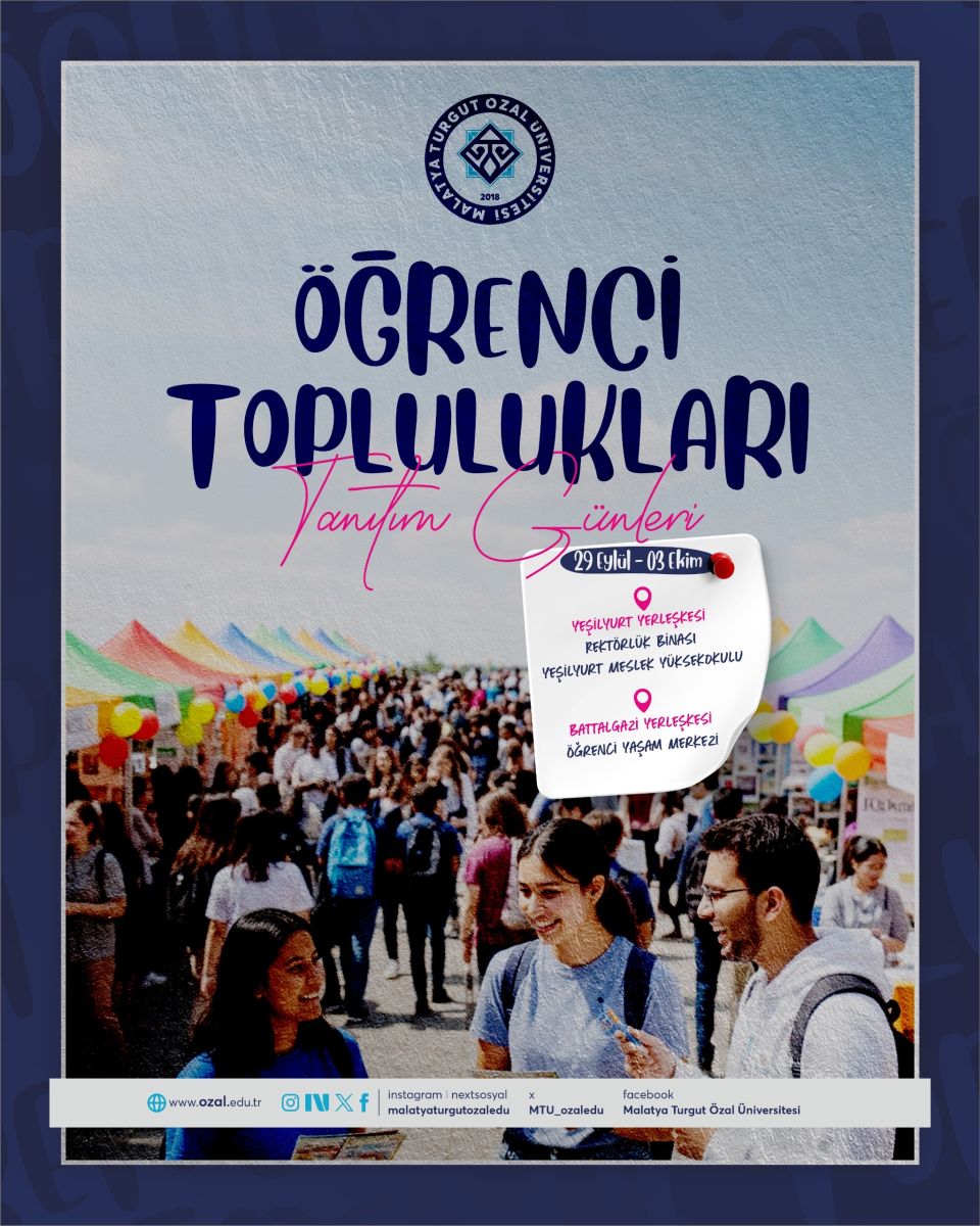 Öğrenci Toplulukları Tanıtım Günleri Güncellendiği Tarih: 24-09-2025 19:48 | Başlangıç Tarihi: 29-09-2025 09:00 | Bitiş Tarihi: 03-10-2025 17:00 | YER: Battalgazi Yerleşkesi Öğrenci Yaşam Merkezi