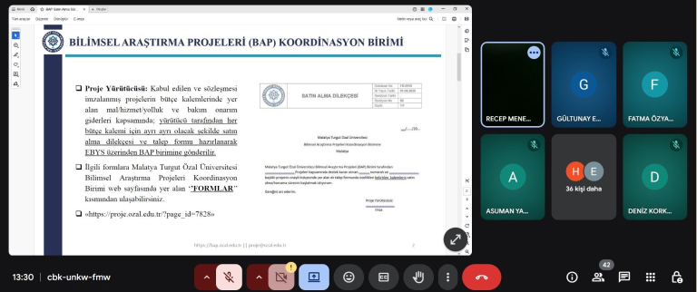 Malatya Turgut Özal Üniversitesi Bilimsel Araştırma Projeleri (BAP) Koordinasyon Birimi tarafından BAP, Türkiye Bilimsel ve Teknolojik Araştırma Kurumu (TÜBİTAK), Türkiye Sağlık Enstitüleri Başkanlığı (TÜSEB) ve diğer dış kaynaklı kurum ve kuruluşlar tarafından desteklenen araştırma projelerinde harcama ve ödeme süreçlerinin etkin şekilde yönetilmesine yönelik “Araştırma Projelerinde Harcama Süreçleri Bilgilendirme Eğitimi” düzenlendi. 19 Kasım 2025 tarihinde çevrim içi olarak düzenlenen etkinliğe yürütücü, araştırmacı ve danışman olarak projelerde görev yapan 50’nin üzerinde akademik personel katılım sağladı. Etkinlikte proje harcamalarının planlanması, satın alma süreçleri, bütçe yönetimi, ödeme prosedürleri, mevzuata uygunluk, raporlama adımları ve BAP projeleri kapsamında e-BAP Otomasyonu hakkında kapsamlı bilgiler sunuldu. Program, sunumların ardından katılımcılardan gelen soruların yanıtlandığı, katkı ve önerilerin değerlendirildiği bölümle tamamlandı.