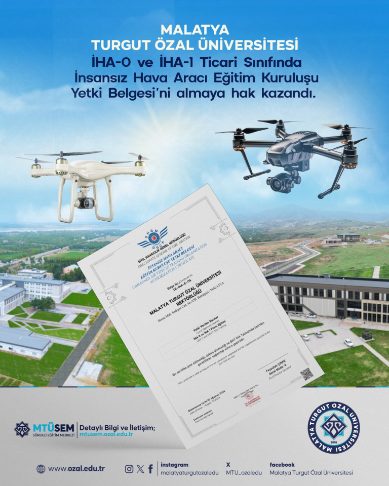 Malatya Turgut Özal Üniversitesi Sürekli Eğitim Uygulama ve Araştırma Merkezi (MTÜSEM), Ulaştırma ve Altyapı Bakanlığı Sivil Havacılık Genel Müdürlüğü (SHGM) tarafından verilen, “İHA-0 ve İHA-1 Ticari Sınıfında İnsansız Hava Aracı Eğitim Kuruluşu Yetki Belgesi” ni almaya hak kazandı.