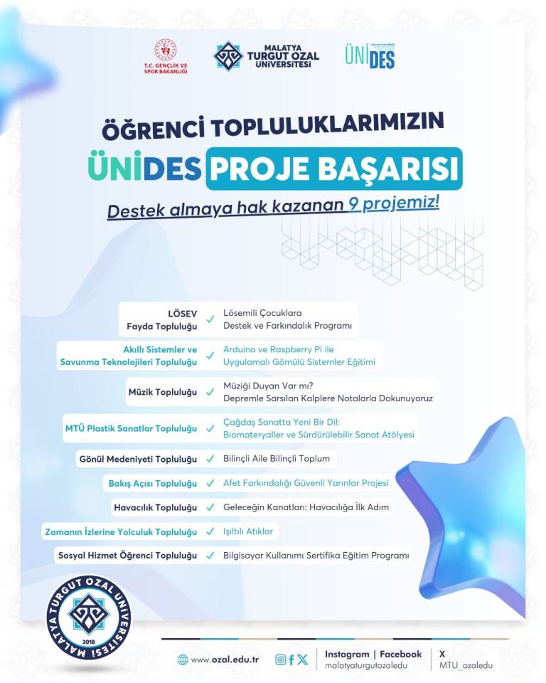 Üniversitemiz öğrenci kulüplerimizin, gençlerin kişisel, akademik ve sosyal gelişimlerini sağlamayı ve bu yolla topluma fayda oluşturmaya dönük yönlerini geliştirmeyi sağlamayı hedefleyen ÜNİDES - Üniversite Öğrenci Kulüplerini Destekleme Programı kapsamında yaptıkları 9 proje başvurusu desteklenmeye hak kazandı.