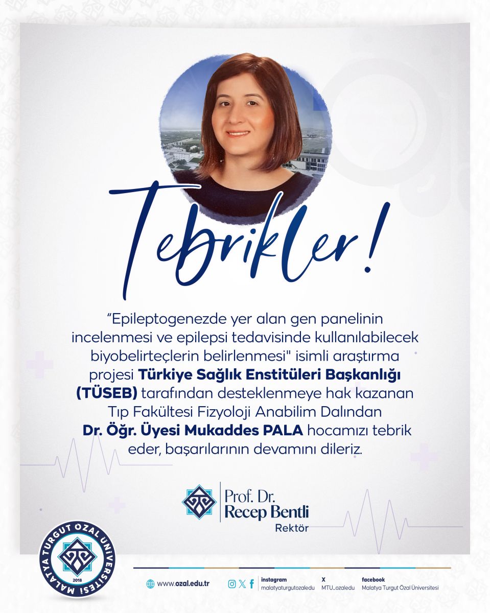“Epileptogenezde yer alan gen panelinin incelenmesi ve epilepsi tedavisinde kullanılabilecek biyobelirteçlerin belirlenmesi" isimli araştırma projesi Türkiye Sağlık Enstitüleri Başkanlığı (TÜSEB) tarafından desteklenmeye hak kazanan Tıp Fakültesi Fizyoloji Anabilim Dalından Dr. Öğr. Üyesi Mukaddes PALA hocamızı tebrik eder, başarılarının devamını dileriz.