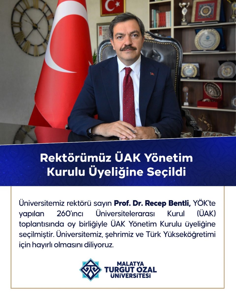 Üniversitemiz rektörü sayın Prof. Dr. Recep Bentli, YÖK'te yapılan 260'ıncı Üniversitelerarası Kurul (ÜAK) toplantısında oy birliğiyle ÜAK Yönetim Kurulu üyeliğine seçilmiştir. Üniversitemiz, şehrimiz ve Türk Yükseköğretimi için hayırlı olmasını diliyoruz.