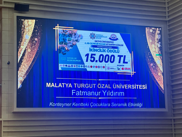 Malatya Turgut Özal Üniversitesi, Anadolu Üniversiteler Birliği (AÜB) himayesinde ve Erciyes Üniversitesi'nin ev sahipliğinde düzenlenen "Erciyes 4. AR-GE Proje Pazarı" etkinliğinde İkincilik Ödülü'ne layık görüldü. 16 Mayıs 2025 tarihinde gerçekleştirilen etkinlikte, Yeşilyurt Meslek Yüksekokulu Endüstriyel Cam ve Seramik Programı öğrencisi Fatmanur Yıldırım, "Konteyner Kentteki Çocuklara Seramik Etkinliği" başlıklı 61 projenin yarıştığı Sosyal ve Beşeri Bilimler kategorisinde İkincilik Ödülünü kazandı. Bu önemli başarıya ulaşan öğrencimizi ve akademisyenlerimizi tebrik eder, gelecek çalışmalarında başarılar dileriz.